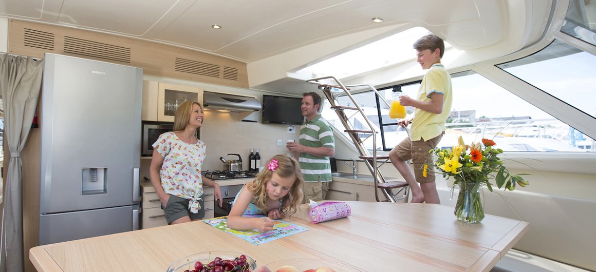 Das Boot ist das am luxuriösesten ausgestattete Boot der LeBoat Flotte. In den 3 Kabinen gibt es je eine Nasszelle mit der Dusche und einem elektrischen WC sowie Wasch- becken. 2 der 3 Kabinen haben nebst den 2 grossen (!!!) Betten ein drittes Bett zu herunterklappen. Das Boot verfügt sogar über eine Klimaanlage! Natürlich auch über eine Heizung :-)